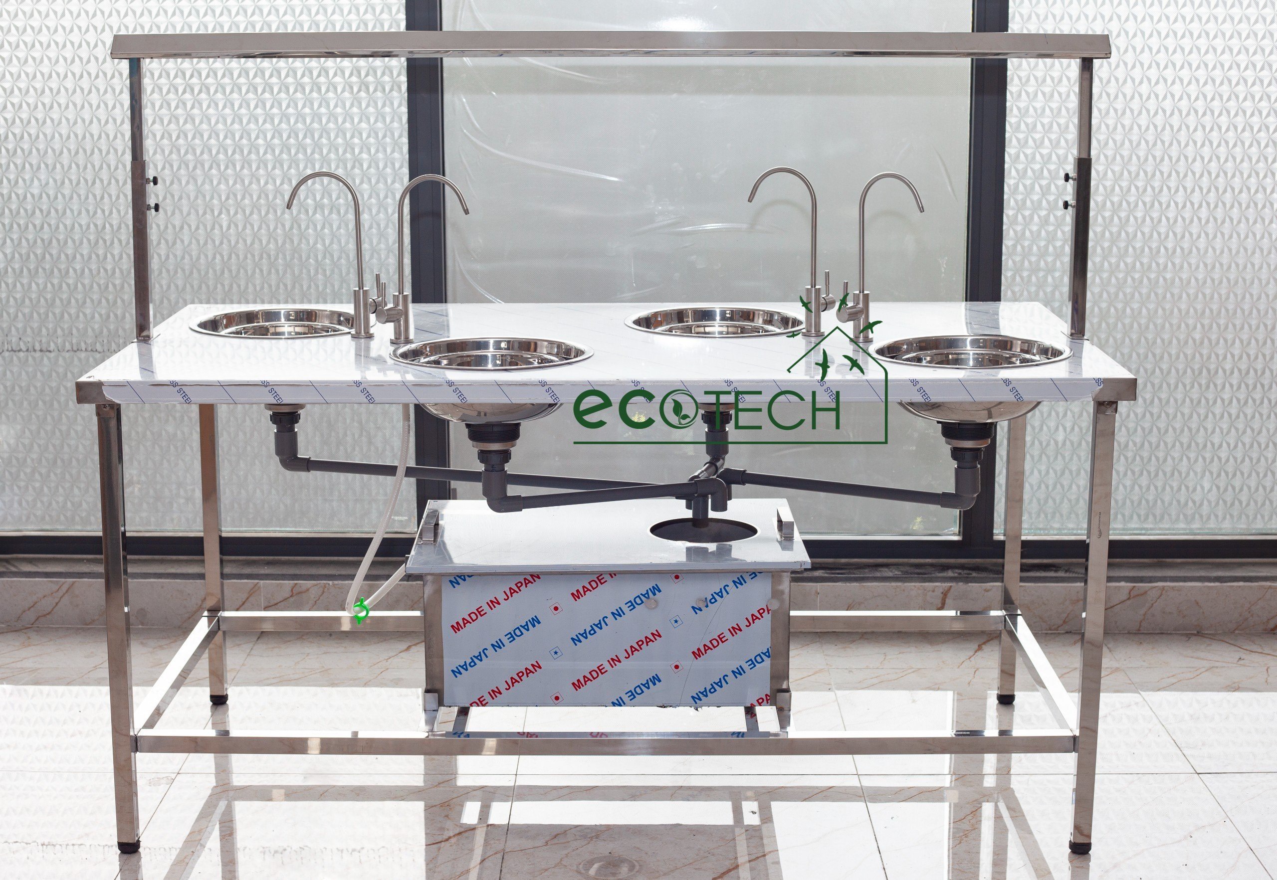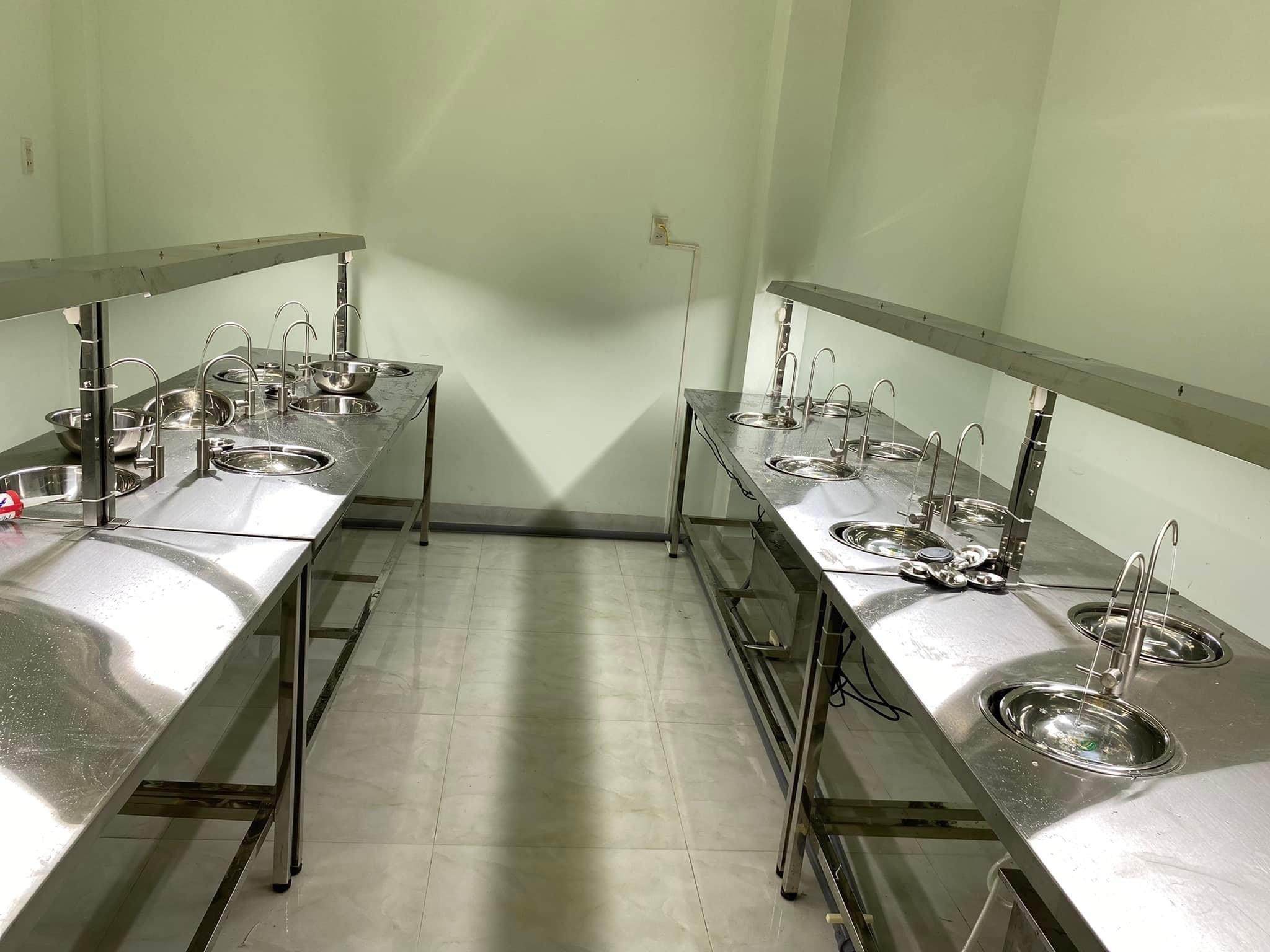 Bàn cung cấp không gian làm việc cho 4 thợ, mỗi người có một bồn rửa và vòi nước riêng, giúp nhặt lông măng và tạp chất trên tổ yến hiệu quả.