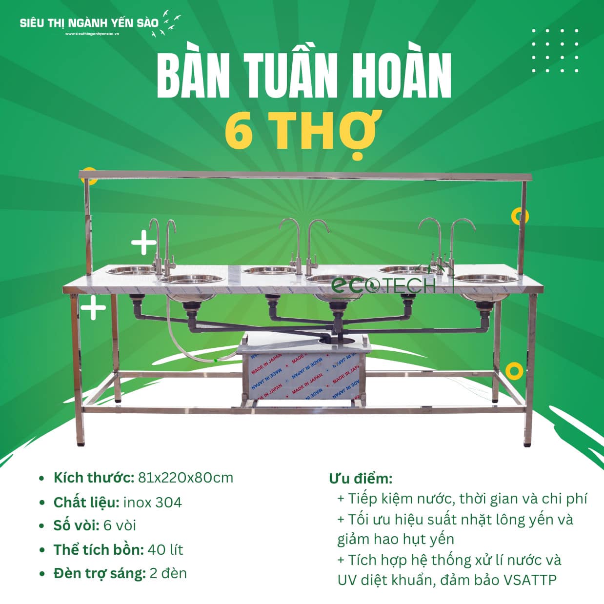 Bàn tuần hoàn 6 thợ của Siêu Thị Ngành Yến Sào là một thiết bị chuyên nghiệp, với các ứng dụng cụ thể trong ngành yến sào như sau: